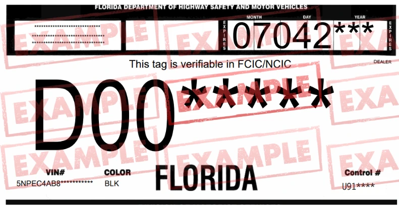 Ejemplo de placa temporal en Florida