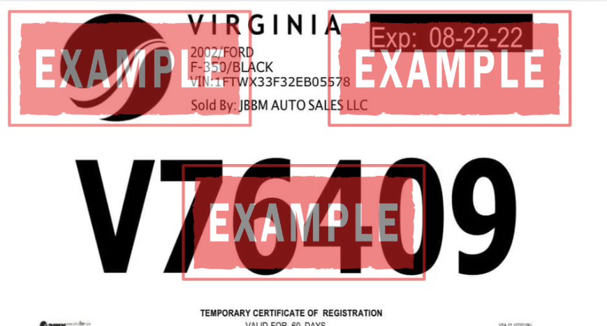 Ejemplo de placas temporales Virginia